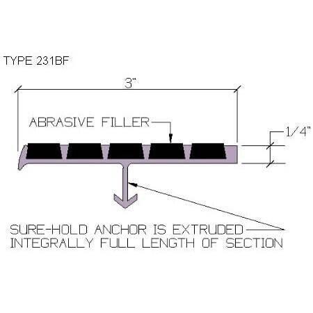 Type 231BF is 3″ wide x 1/4″ thick. Lengths are made to order. Maximum length is 12’0″ in one section (over 12’0″ will be made in equal sections).